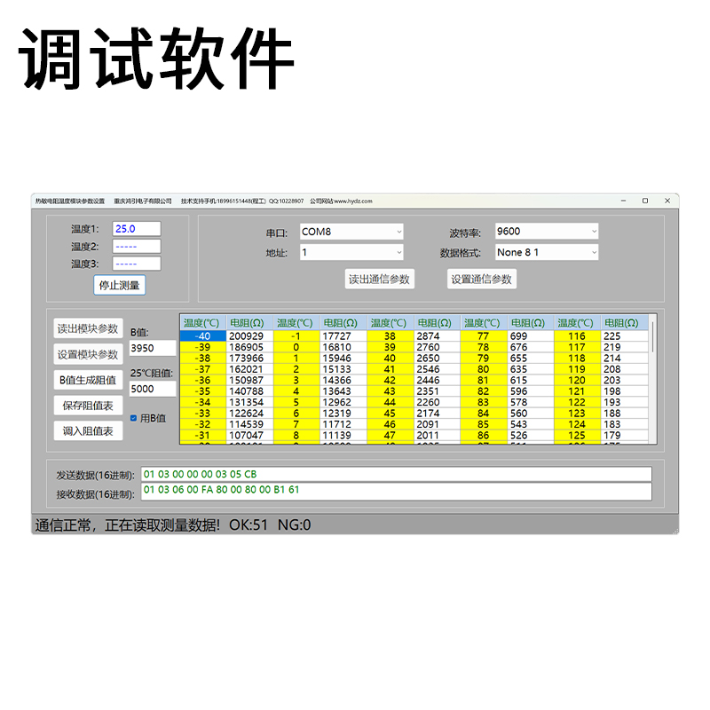 (1) 用B值選擇為1時:使用熱敏電阻B值,熱敏電阻25℃時電阻值來換算溫度值;用B值選擇為0時:使用阻值溫度對照表,此表可以通過上位機設置軟件編輯設置,通過熱敏電阻廠家的阻值溫度對照表,可使換算出的溫度值更準確。