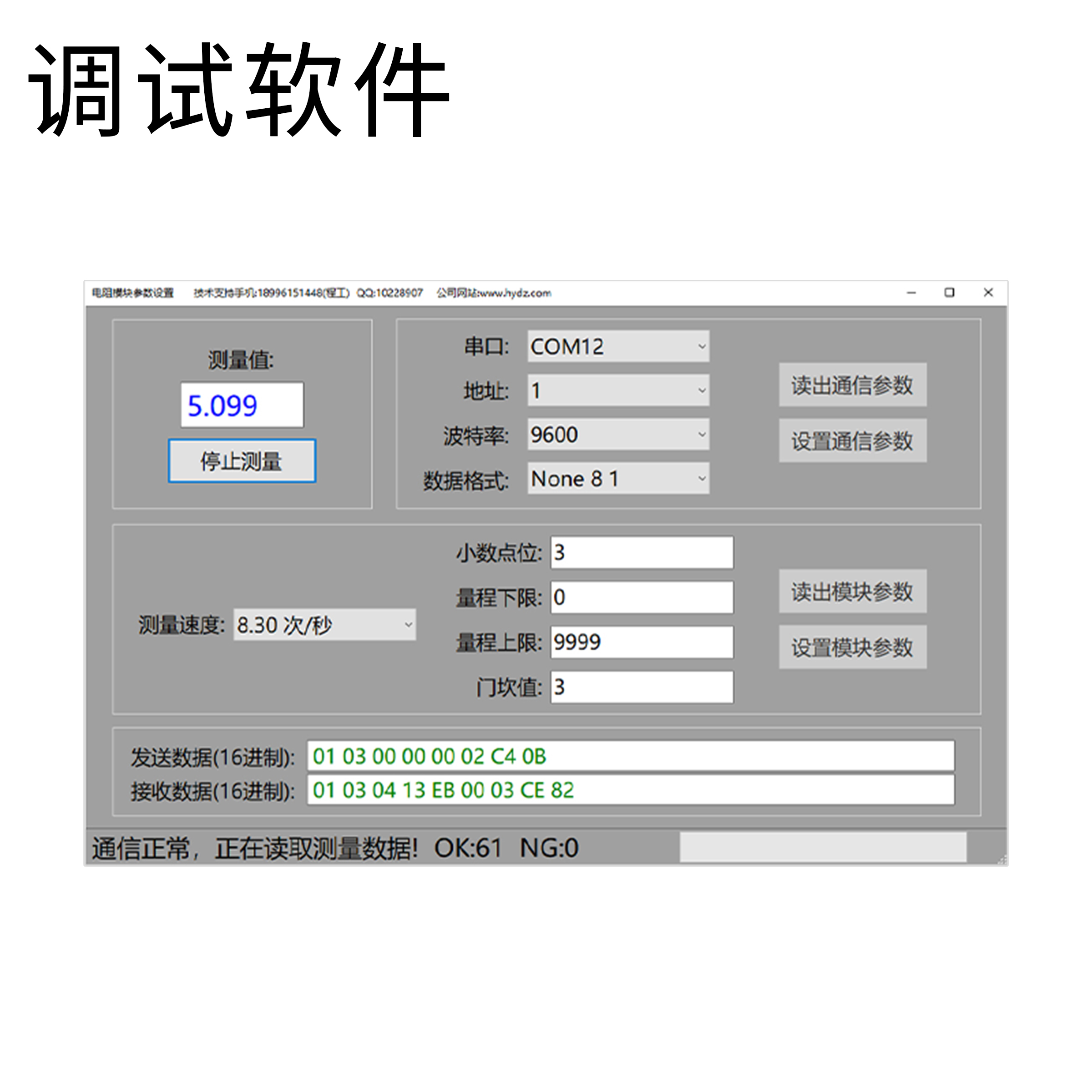 電阻測量,支持2線制接法電阻測量和4線制接法電阻測量,最小分辨率到1mΩ,通過RS485通信或模擬量變送輸出。RS485通信接口,采用標準的modbus-rtu協議,通信地址:1~247;波特率:2400、4800、9600、19200、38000、57600、115200;校驗位:無校驗,奇校驗,偶校驗。模擬量變送輸出,模擬量可選DC4-20mA,DC0-20mA,DC0-5V,DC0-10V等,輸出的模擬量與測量電阻值成正比。電源輸入范圍DC9~36V,電源,輸入信號,RS485通信,模擬量變送輸出之間相互電氣隔離,隔離電壓≥2KV。提供參數設置上位機軟件,方便對模塊參數設置及通信調試。