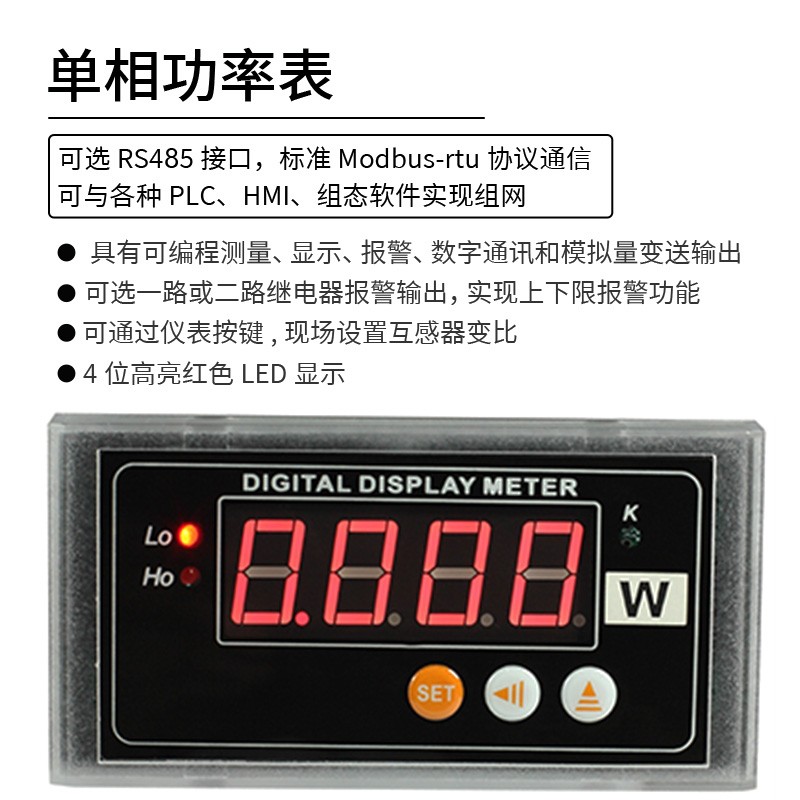HY194系列數(shù)顯單相交流功率表,是一種具有可編程測(cè)量、顯示、報(bào)警、數(shù)字通訊和模擬量變送輸出等功能的智能儀表,廣泛應(yīng)用于變電站自動(dòng)化、配電自動(dòng)化、智能建筑、自動(dòng)化生產(chǎn)線、測(cè)試臺(tái)等?;ジ衅髯儽瓤赏ㄟ^儀表按鍵現(xiàn)場(chǎng)設(shè)置,使用方便靈活。4位高亮紅色LED顯示;可選一路或二路繼電器報(bào)警輸出,實(shí)現(xiàn)上下限報(bào)警功能;可選RS-485數(shù)字通訊接口,采用國際標(biāo)準(zhǔn)MODBUS-RTU通訊協(xié)議,可與各種PLC、HMI、組態(tài)軟件實(shí)現(xiàn)組網(wǎng);可選模擬量(DC0~20mA、DC4~20mA、DC0~5V、DC0~10V等)變送輸出。