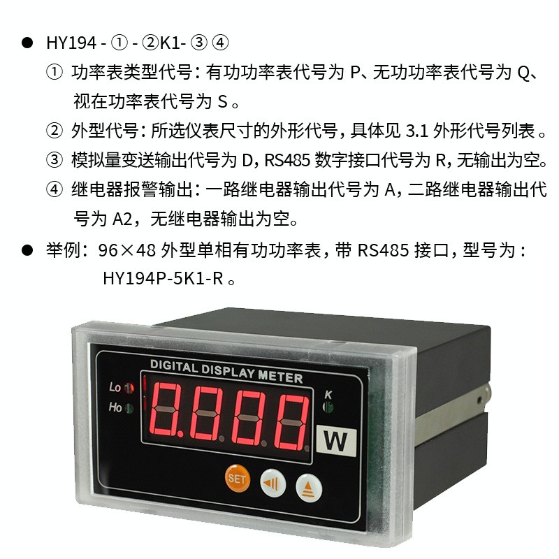 舉例:96×48外型單相有功功率表,帶RS485接口,型號(hào)為:HY194P-5K1-R。