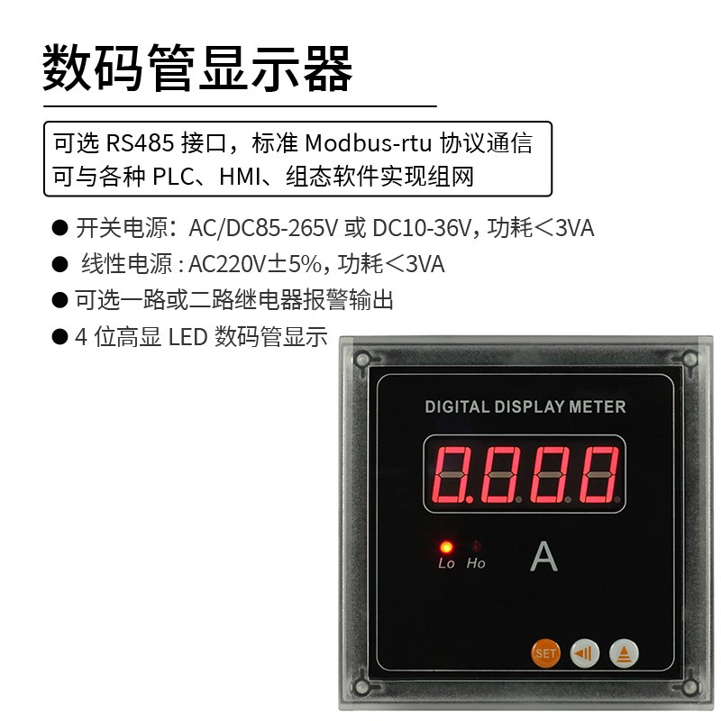 HY195系列數碼管顯示器,采用4位高顯LED數碼管顯示,通過RS-485數字接口送顯示數值,采用國際標準的modbus-rtu協議,可以與各種PLC、HMI、組態軟件實現組網。可選一路或二路繼電器報警輸出,實現上下限、上上限、下下限報警功能或遙控功能。