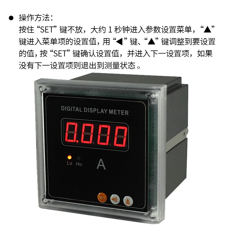 按住“SET”鍵不放,大約1秒鐘進(jìn)入?yún)?shù)設(shè)置菜單,“▲”鍵進(jìn)入菜單項(xiàng)的設(shè)置值,用“?”鍵、“▲”鍵調(diào)整到要設(shè)置的值,按“SET”鍵確認(rèn)設(shè)置值,并進(jìn)入下一設(shè)置項(xiàng),如果沒(méi)有下一設(shè)置項(xiàng)則退出到測(cè)量狀態(tài)。