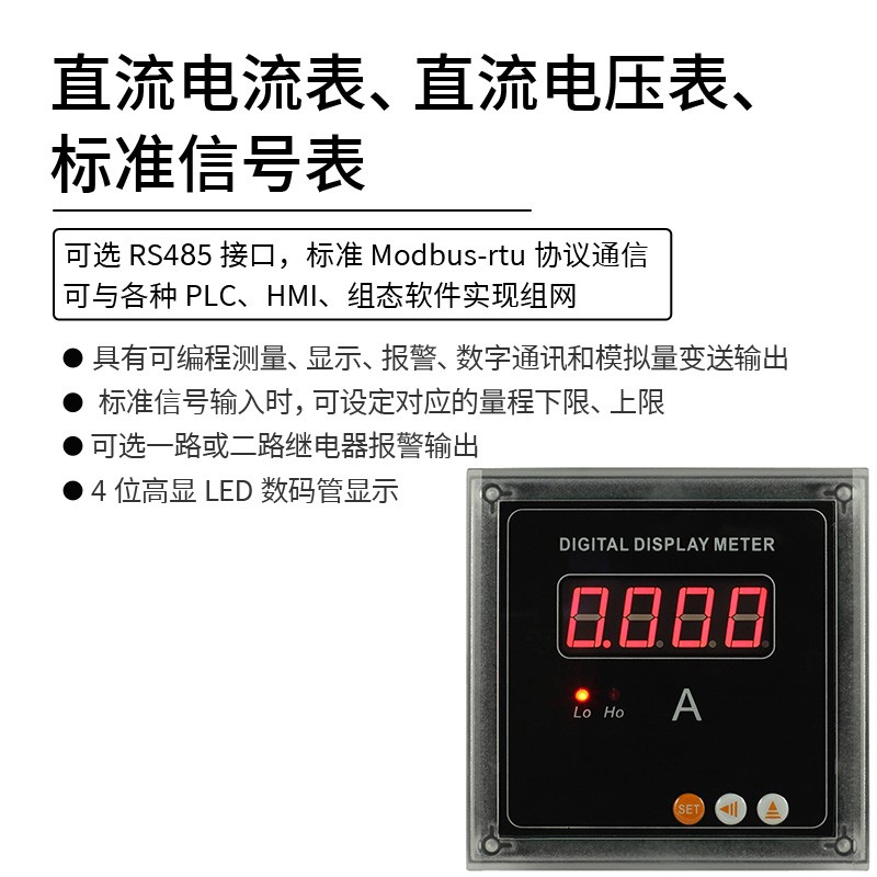 4位高亮度紅色LED顯示;可選一路或二路繼電器報(bào)警輸出,實(shí)現(xiàn)上下限、上上限、下下限報(bào)警功能;可選RS485數(shù)字接口通訊,采用國(guó)際標(biāo)準(zhǔn)MODBUS-RTU通訊協(xié)議,可與各種PLC、HMI、組態(tài)軟件實(shí)現(xiàn)組網(wǎng);可選模擬量(DC0~20mA、DC4~20mA、DC0~5V、DC0~10V等)變送輸出,輸入信號(hào)與模擬量輸出信號(hào)隔離,成線性關(guān)系。
