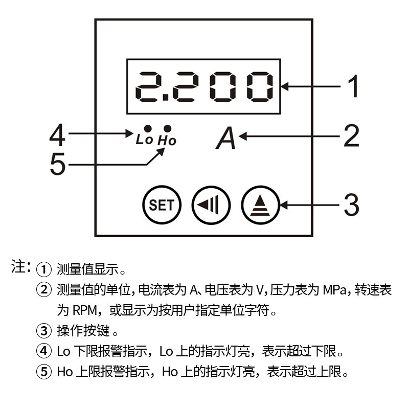 ②、測(cè)量值的單位,電流表為A、電壓表為V,壓力表為MPa,轉(zhuǎn)速表為RPM,或顯示為按用戶指定顯示單位。